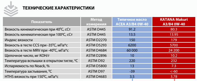 KATANA Makuri A3/B4 0W-40 – полностью синтетическое моторное масло на основе PАО (Polyalphaolefins) и GTL (Gas to Liquid) как для спортивных, так и для гражданских высокооборотистых бензиновых и дизельных двигателей легковых автомобилей, оснащенных турбонаддувом и каталитическими устройствами нейтрализации отработавших газов (без GPF/DPF). Специально разработано с учётом работы двигателя в экстремальных условиях высоких нагрузок, максимальных оборотов и скоростей, где необходима стабильность вязкости в широком диапазоне температур, формируя на поверхности трения прочную масляную пленку.