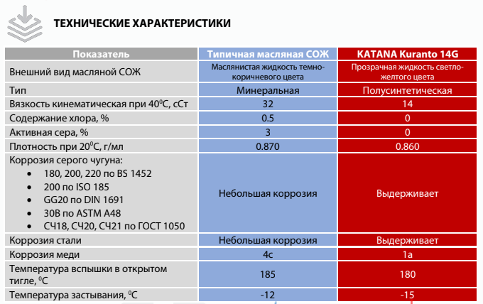 KATANA Kuranto 14G – маловязкая масляная полусинтетическая смазочно-охлаждающая жидкость (СОЖ) для операций шлифования. Содержит в своем составе пакет противоизносных, противозадирных, антиокислительных, антикоррозионных и противотуманных присадок. Обладает высокими смазывающими свойствами, увеличивает срок службы инструмента и обладает низкой склонностью к образованию масляного тумана. Обеспечивает высокое качество поверхности.