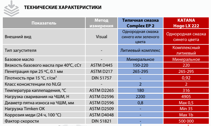 KATANA Hogo LX 222 S – высокоэффективная синтетическая смазка на основе ПАО (полиальфаолефины) и комплексного литиевого загустителя, усиленная высококачественной противозадирной (EP) присадкой и разработанная для тяжелых условий эксплуатации и широкого диапазона температур. Благодаря применению базовых масел ПАО обладает превосходными низкотемпературными свойствами. Показывает высокие эксплуатационные характеристики даже при ударных, временных и вибрационных нагрузках с водой. Обеспечивает отличную защиту от окисления и коррозии. Гасит вибрации и ударные нагрузки, снижает трение и износ.