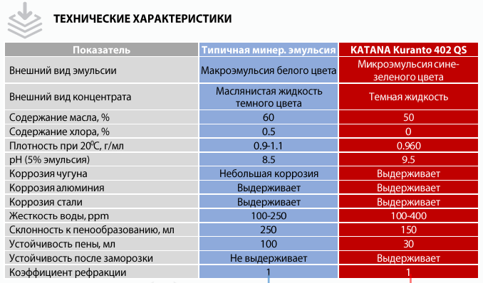 KATANA Kuranto 402QS – концентрированная биостабильная водосмешиваемая смазочно-охлаждающая жидкость для высоконагруженного применения. Образует полупрозрачную эмульсию с высокими антикоррозионными свойствами, надежно защищает детали и направляющие металлообрабатывающих станков от коррозии. Обладает высокой смазывающей способностью, что обеспечивает превосходные охлаждающие свойства режущего лезвия инструмента. Разработана на основе высокотехнологичного пакета присадок с использованием эмульгаторов, ЕР присадок, пеногасителей, биостабильных компонентов и антикоррозионных присадок.