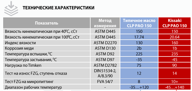 KATANA KISSAKI CLP PAO 150 соответствует или рекомендуется под замену масел категории DIN 51517 часть 3 (CLP), ISO 6743-6/12925-1 (CKD), US Steel 224, Cincinnati Milacron, David Brown S1.53.106, Flender, AGMA 9005-E02