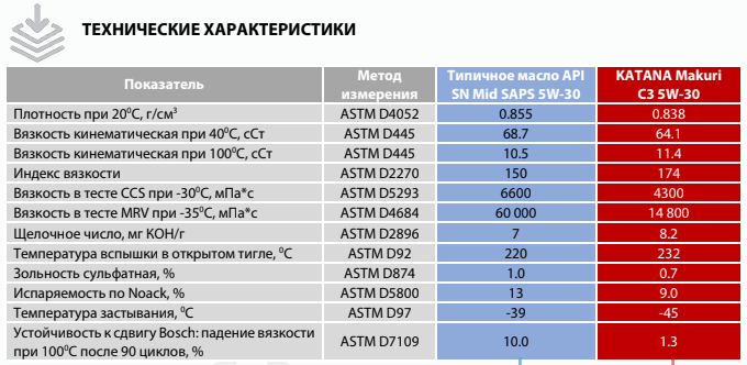 KATANA MAKURI C3 5W-30 соответствует или рекомендуется под замену масел категории ACEA С3, API SN Plus/SN/CF, MB 229.31/51, BMW LL-04, GM Dexos 2, VW 502.00/505.00. Также возможно применение в автомобилях Fiat, Hyundai, KIA, Nissan, Renault, Ssang Yong, Suzuki и др согласно инструкции по эксплуатации