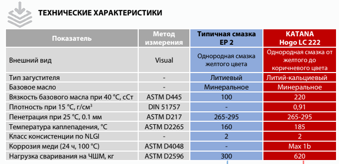 KATANA Hogo LC 222 – смазка на минеральной основе литий- кальциевого мыла c противозадирными свойствами. Обладает хорошей водо- и паронепроницаемостью. Благодаря противозадирным (EP) присадкам показывает высокие эксплуатационные характеристики даже при больших нагрузках и высоких температурах. Гасит вибрации и ударные нагрузки, снижает трение и износ. Защищает подшипники в тяжелых условиях, в воде и грязи. Также обеспечивает герметичность.