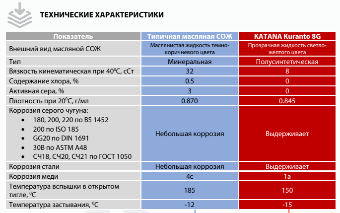 KATANA Kuranto 8G – маловязкая масляная полусинтетическая смазочно-охлаждающая жидкость (СОЖ) для операций шлифования. Содержит в своем составе пакет противоизносных, противозадирных, антиокислительных, антикоррозионных и противотуманных присадок. Обладает высокими смазывающими свойствами, увеличивает срок службы инструмента и обладает низкой склонностью к образованию масляного тумана. Обеспечивает высокое качество поверхности.