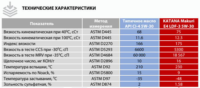 KATANA MAKURI E4 LDF-3 5W-30 соответствует или рекомендуется под замену масел категории ACEA E7/E4, Scania LDF-3/LDF-2/LDF, MB 228.5, Volvo VDS-3, Deutz DQC III-10, DAF Extended Drain, Renault RXD/RLD-2, Mack EO-M Plus/EO-N, MTU 3.0, MAN M3277