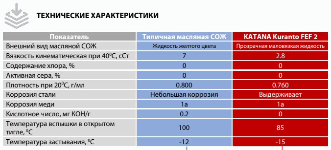 KATANA Kuranto FEF 2 маловязкая быстроиспаряющаяся смазочно-охлаждающая жидкость (СОЖ), представляющая собой глубокоочищенную маловязкую нефтяную фракцию без присадок.