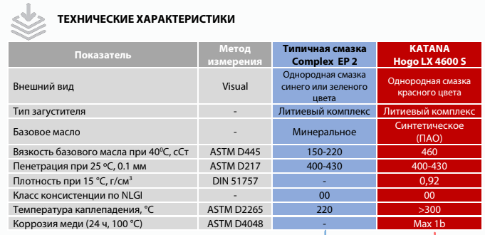KATANA Hogo LX 4600 S – полужидкая, высокоэффективная синтетическая смазка на основе литиевого комплекса. Усилена высококачественной противозадирной (EP) присадкой и разработана для тяжелых условий эксплуатации и высоких температур.